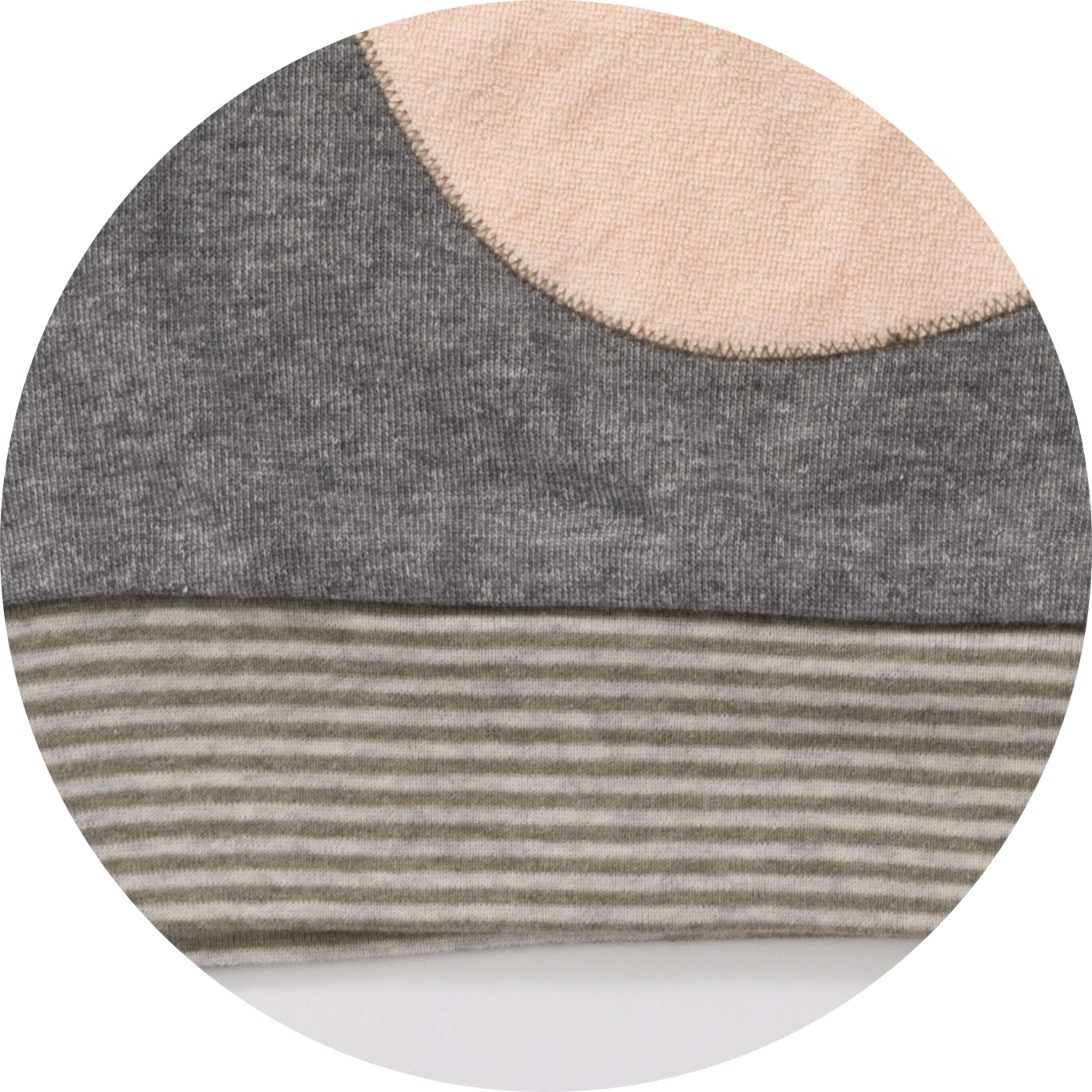 スウェット生地よりも薄手で、表面はなめらか、裏面はループ状になった柔らかい生地。軽くて通気性がよく、程よい伸縮性があるので、赤ちゃんの動きを妨げず快適な着心地が続きます。肌寒い季節の羽織りや、春秋のちょうどいい気温にぴったりの素材です。