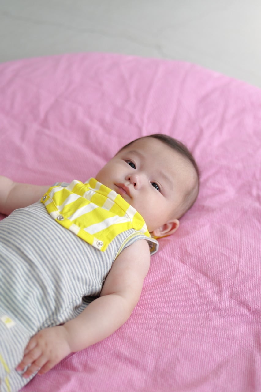 やわらかく、ほどよい伸縮性のある生地。赤ちゃんの動きをさまたげず、よく伸びてフィットするので、お着替えしやすく快適な着心地が続きます。