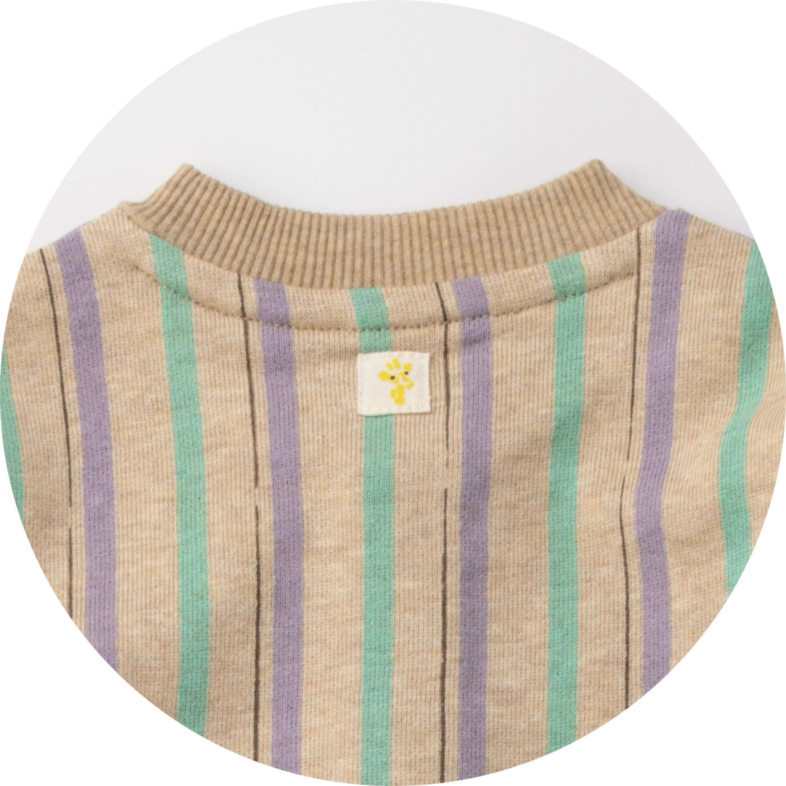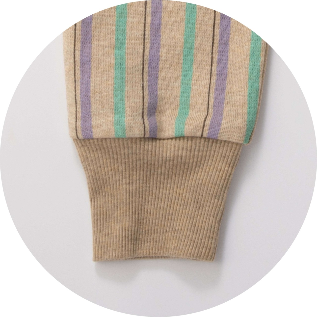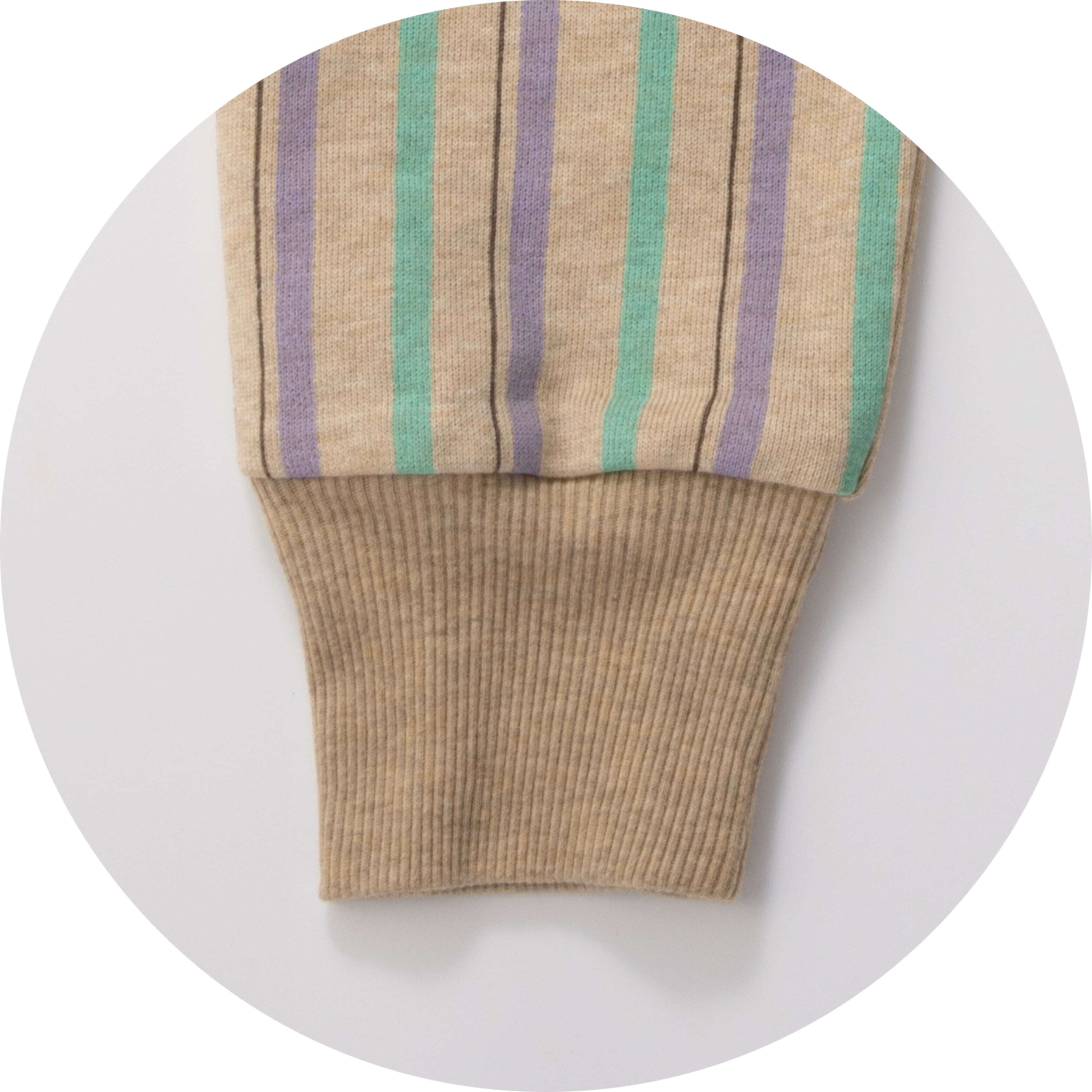 スウェット生地よりも薄手で、表面はなめらか、裏面はループ状になった柔らかい生地。軽くて通気性がよく、程よい伸縮性があるので、赤ちゃんの動きを妨げず快適な着心地が続きます。肌寒い季節の羽織りや、春秋のちょうどいい気温にぴったりの素材です。