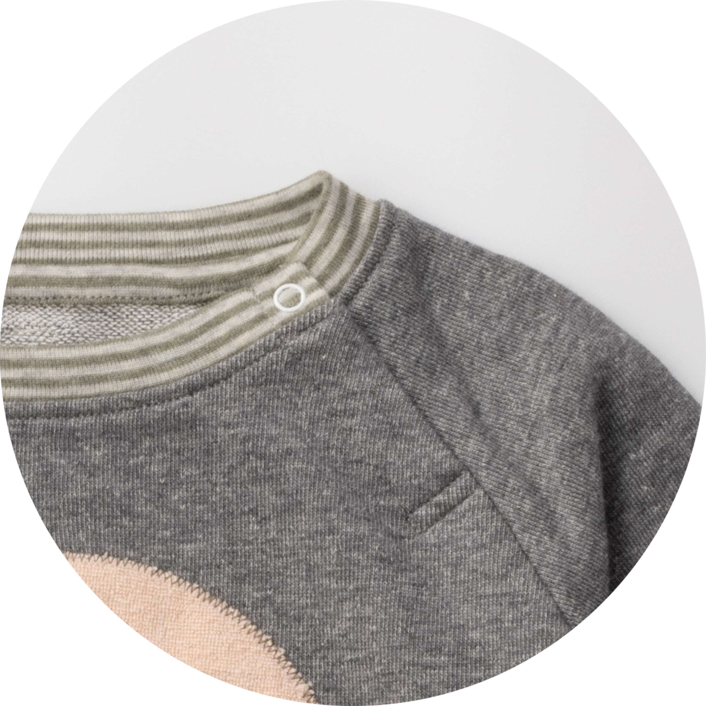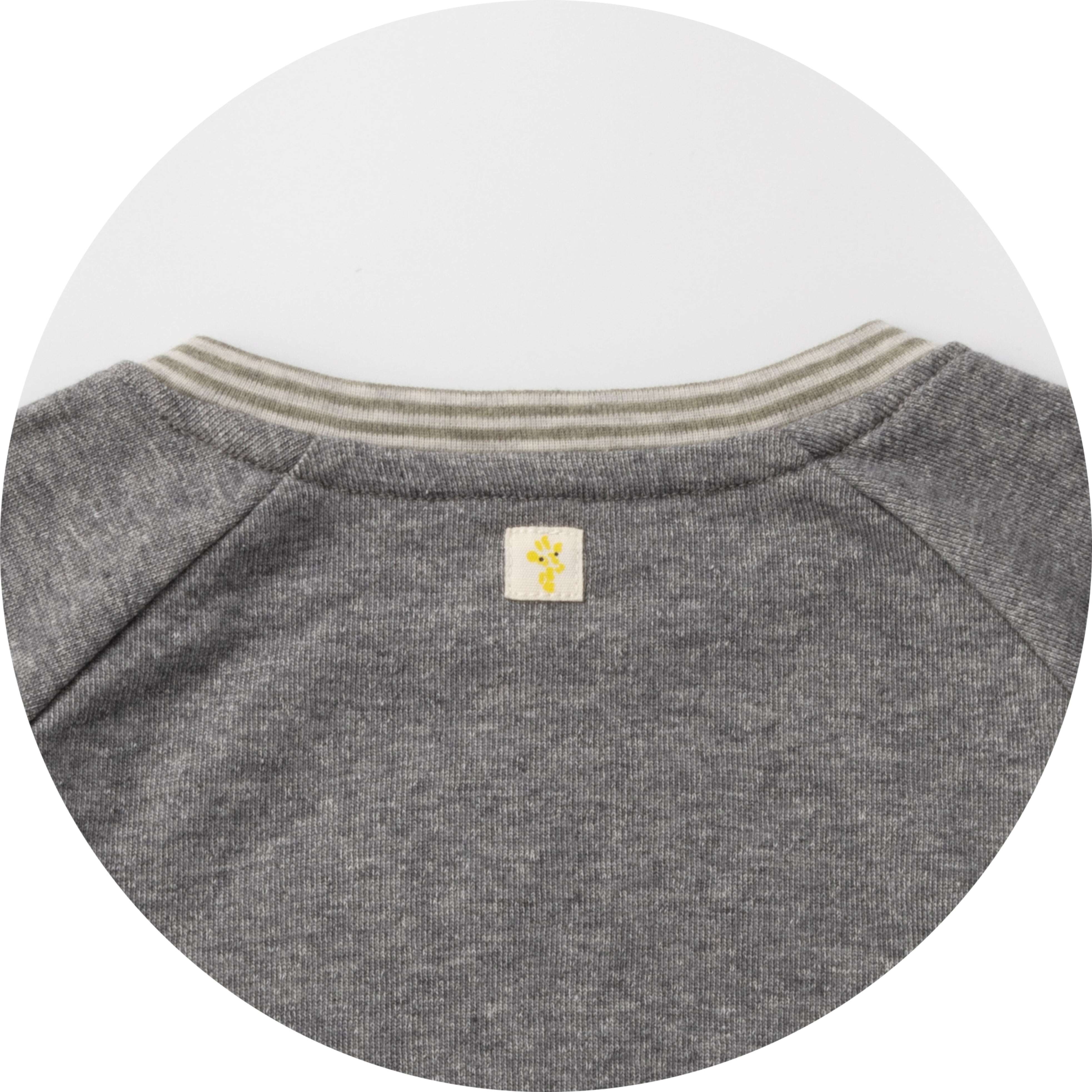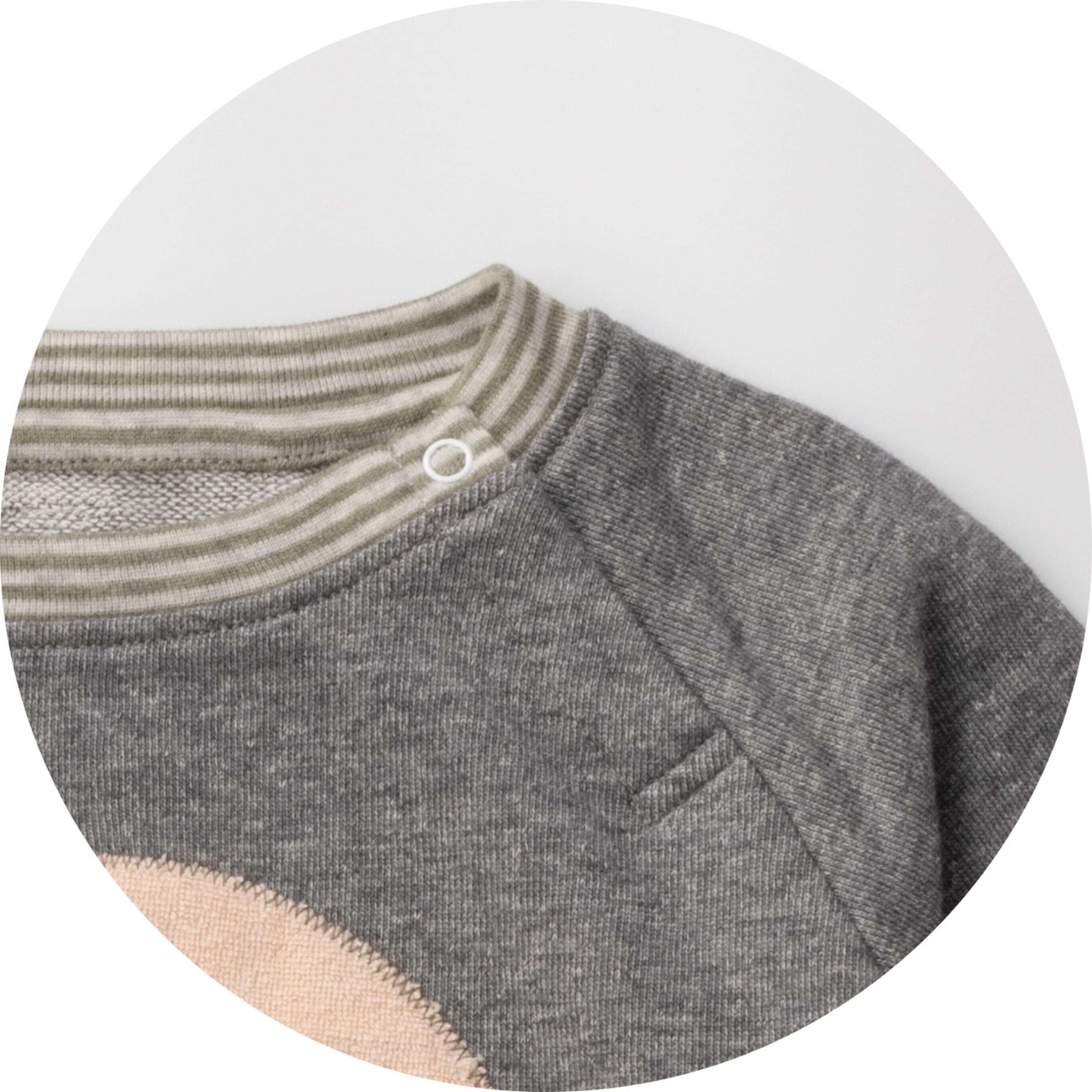 スウェット生地よりも薄手で、表面はなめらか、裏面はループ状になった柔らかい生地。軽くて通気性がよく、程よい伸縮性があるので、赤ちゃんの動きを妨げず快適な着心地が続きます。肌寒い季節の羽織りや、春秋のちょうどいい気温にぴったりの素材です。