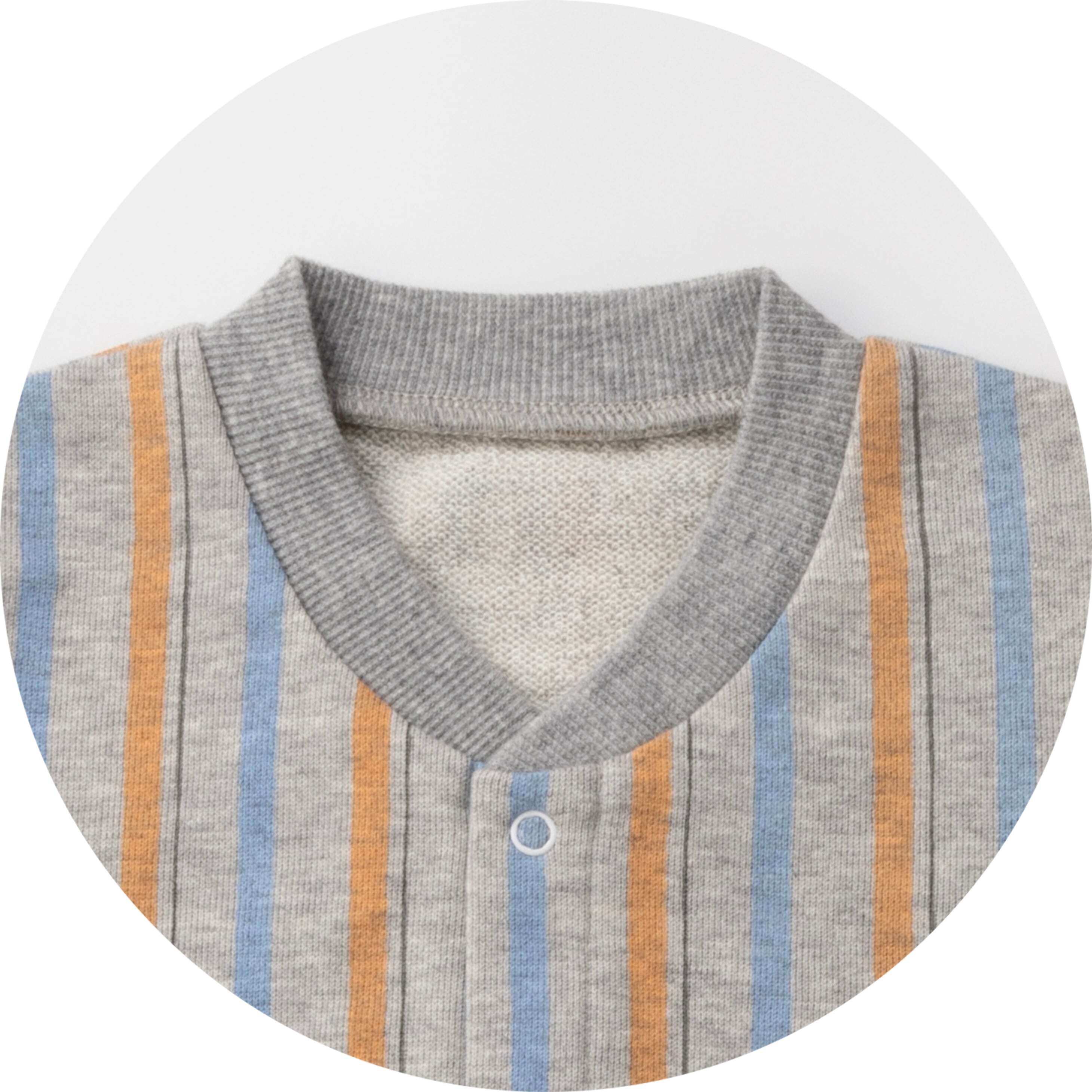 スウェット生地よりも薄手で、表面はなめらか、裏面はループ状になった柔らかい生地。軽くて通気性がよく、程よい伸縮性があるので、赤ちゃんの動きを妨げず快適な着心地が続きます。肌寒い季節の羽織りや、春秋のちょうどいい気温にぴったりの素材です。